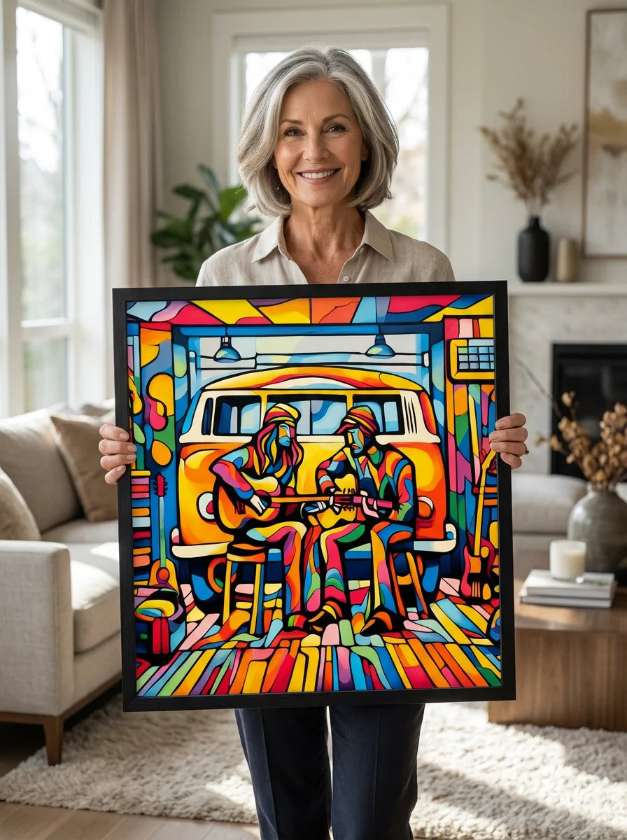“Wine by the River” bursts with vibrant, Picasso‑kissed color as a man and woman share a bottle of wine beside a softly murmuring river. Their first date—born from a spark at work—glows with chemistry and possibility. Shaped through countless sketches and 30 Grok A.I. iterations by Darrell Griffin, this piece radiates bold, irresistible romantic energy.