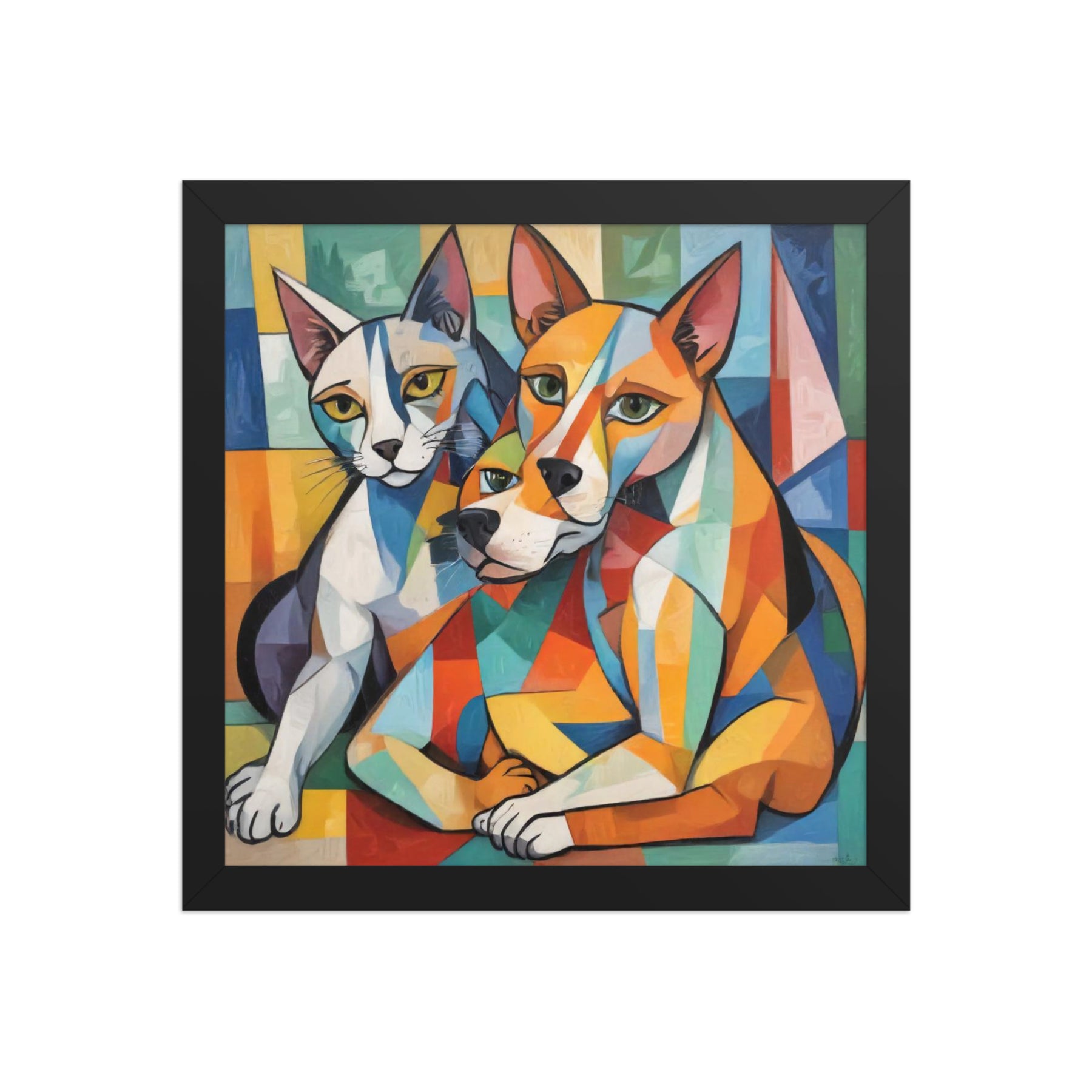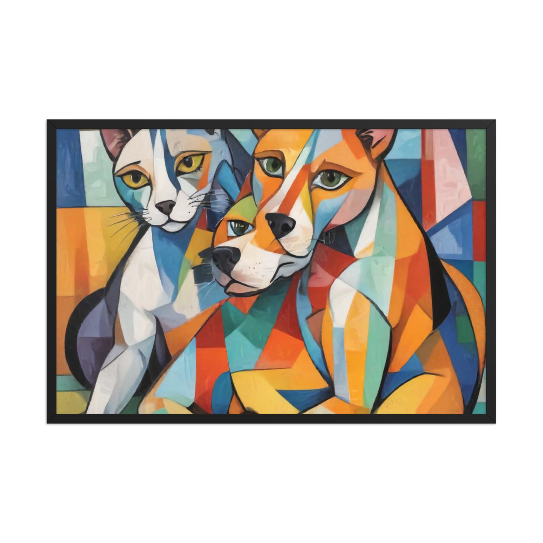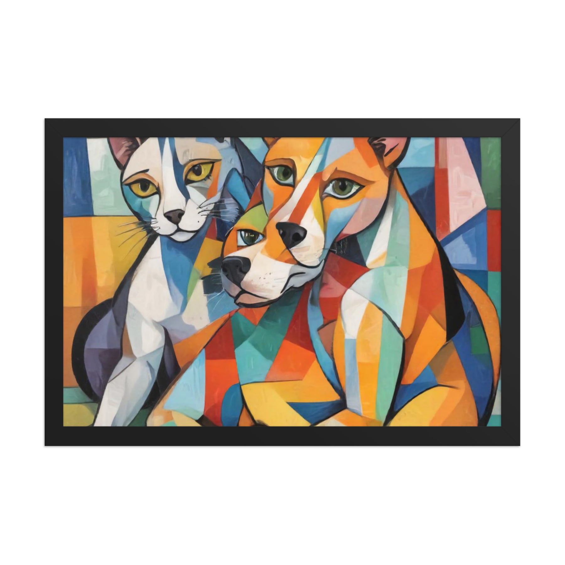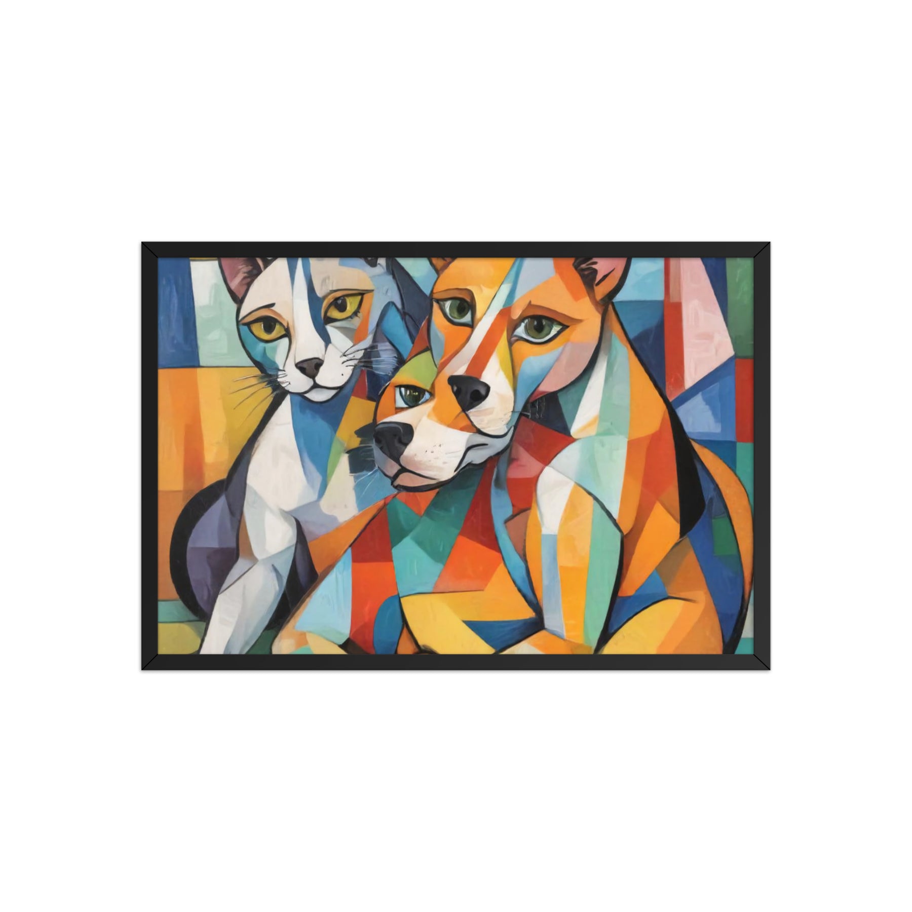 Bring vibrant whimsy to your space with "Two Dogs and a Cat," an abstract masterpiece by Darrell Griffin. Inspired by Picasso's bold palette, this framed poster bursts with electric blues, fiery reds, and sunny yellows, capturing two playful dogs and a sly cat in dynamic, cubist forms that dance across the canvas. Available in sizes from 8" x 10" to 24" x 36", it's printed on thick 10.3 mil (189 g/m²) matte paper for vivid, fade-resistant color.