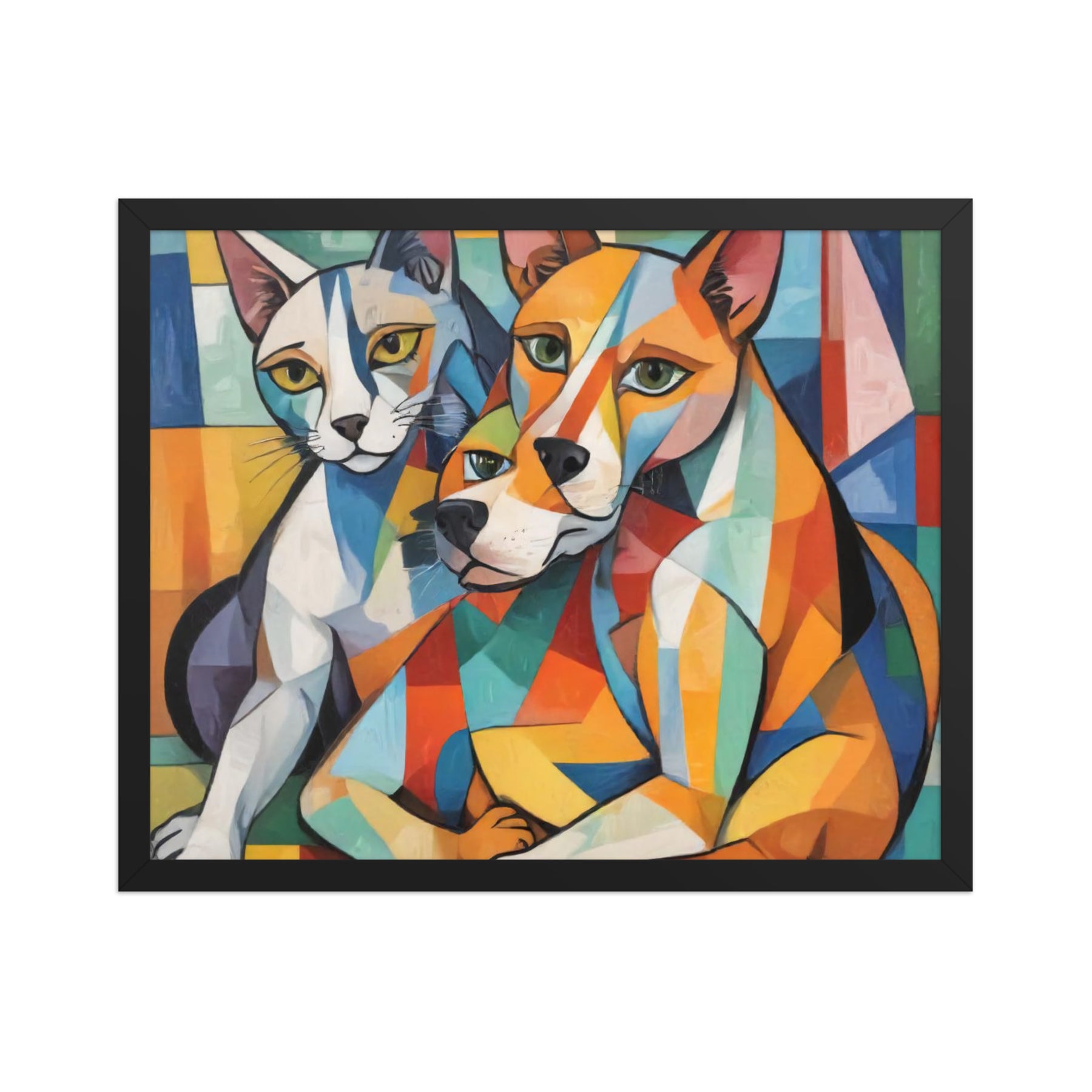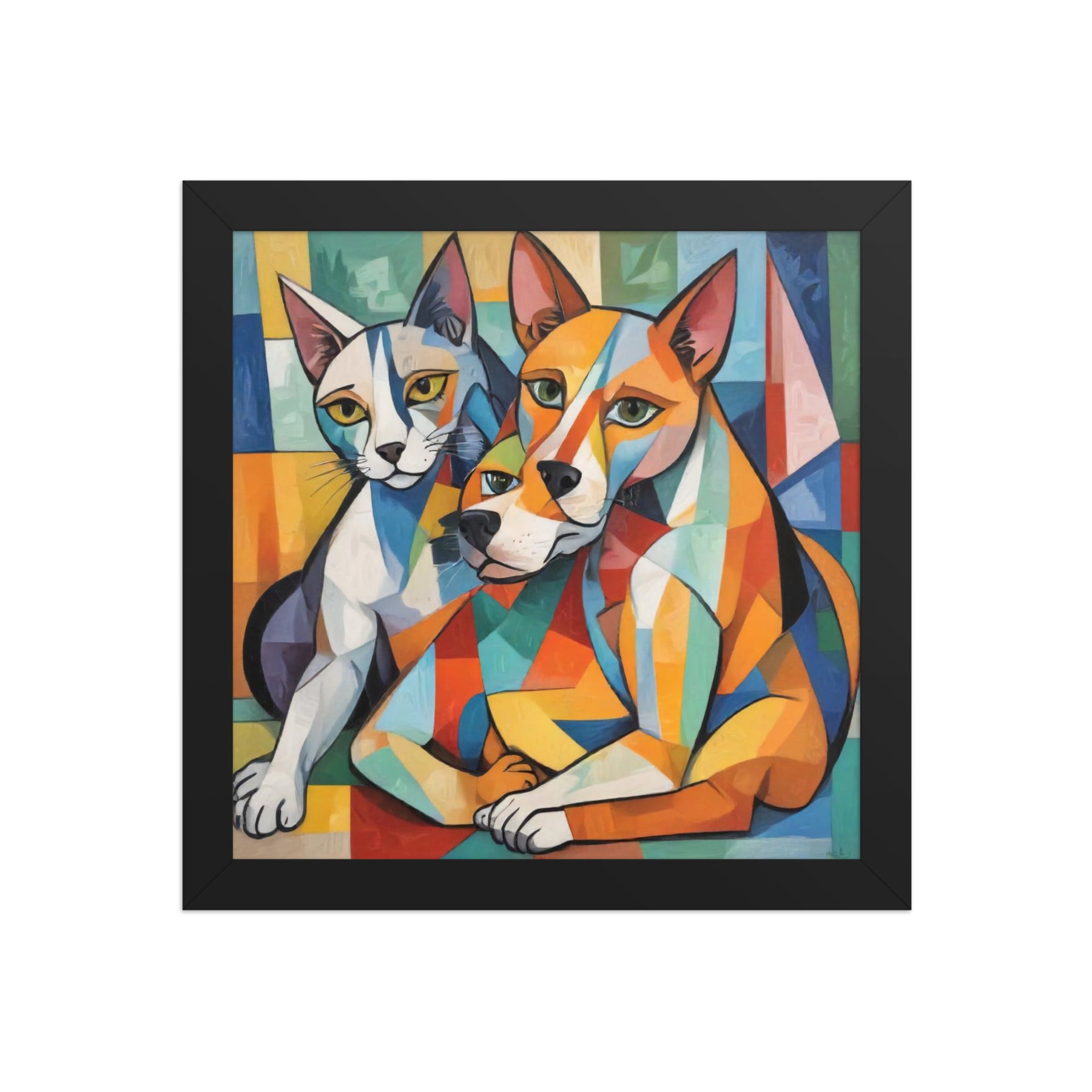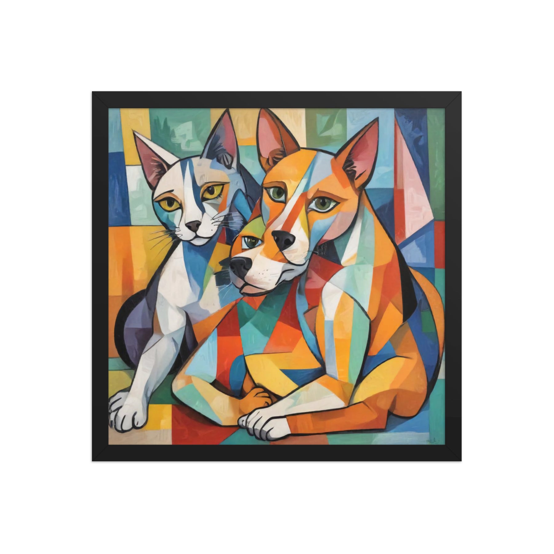 Bring vibrant whimsy to your space with "Two Dogs and a Cat," an abstract masterpiece by Darrell Griffin. Inspired by Picasso's bold palette, this framed poster bursts with electric blues, fiery reds, and sunny yellows, capturing two playful dogs and a sly cat in dynamic, cubist forms that dance across the canvas. Available in sizes from 8" x 10" to 24" x 36", it's printed on thick 10.3 mil (189 g/m²) matte paper for vivid, fade-resistant color.