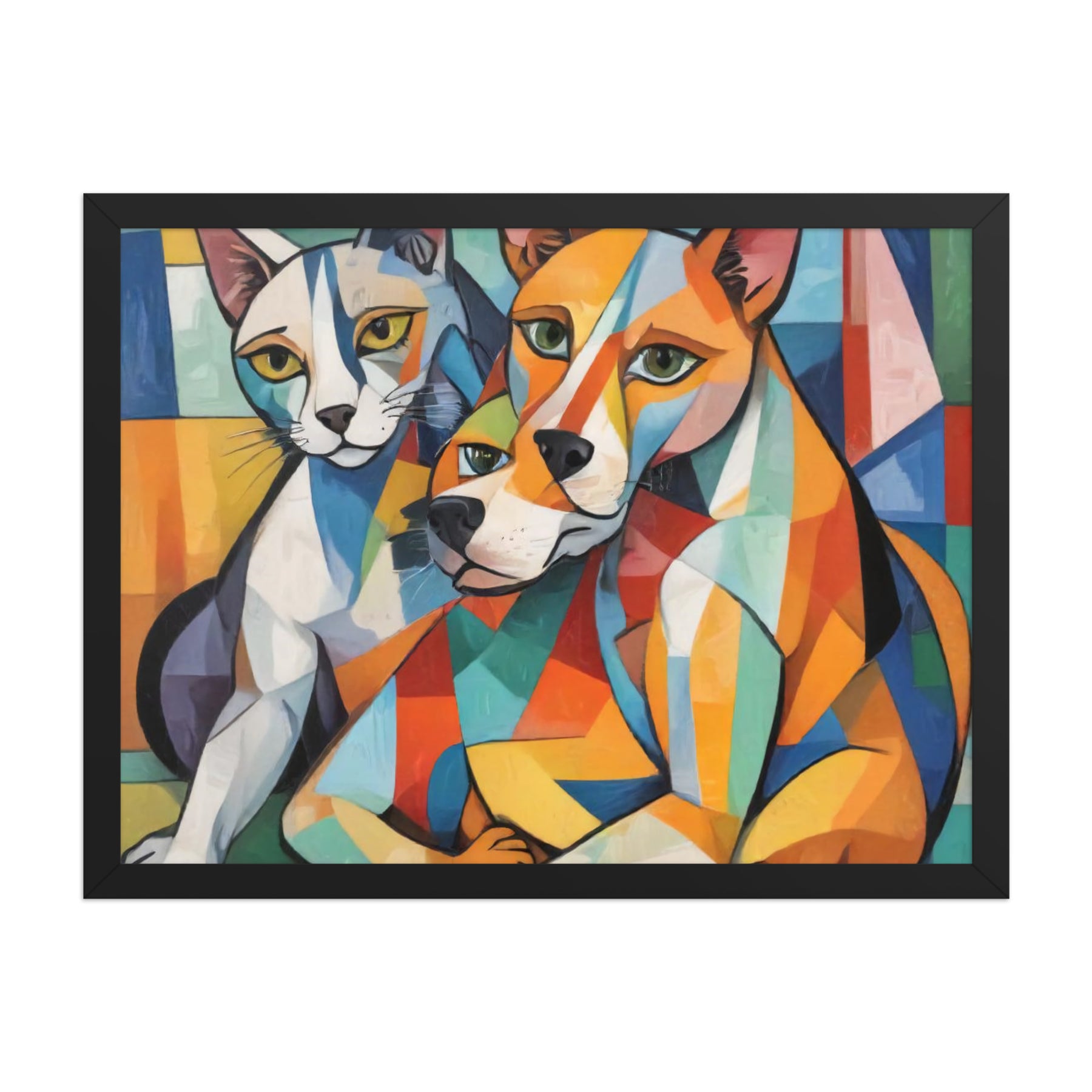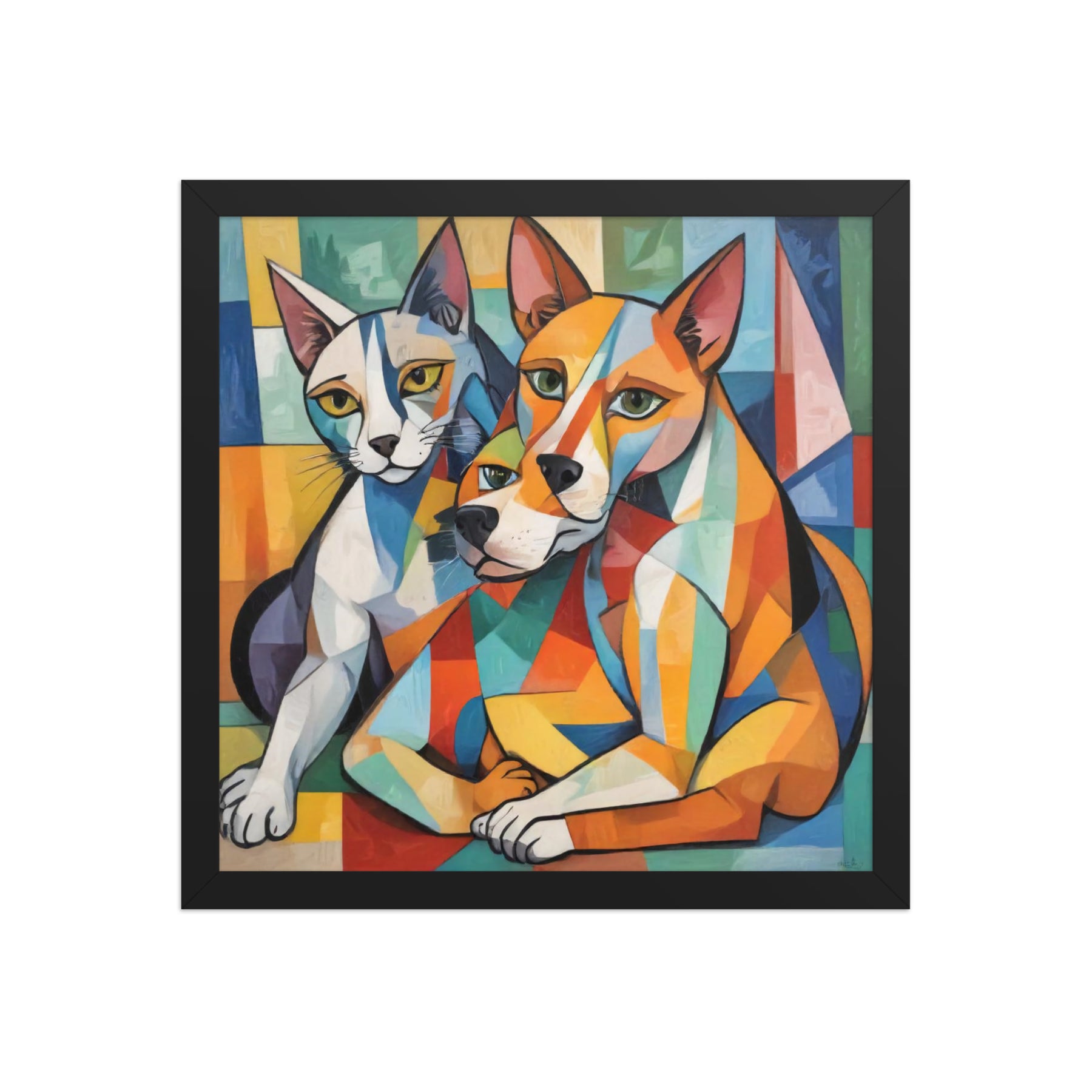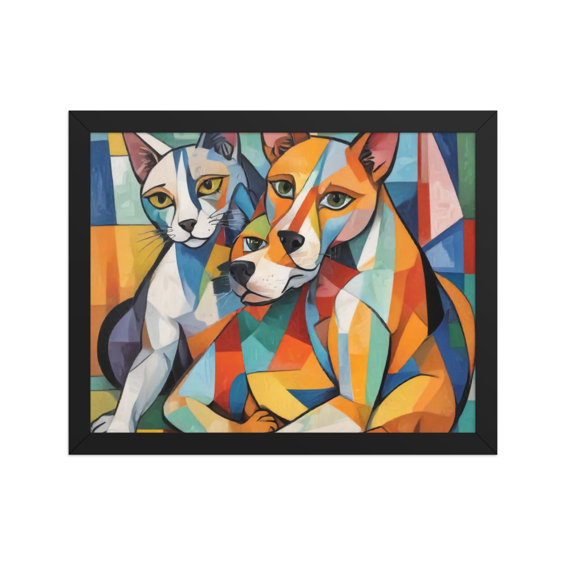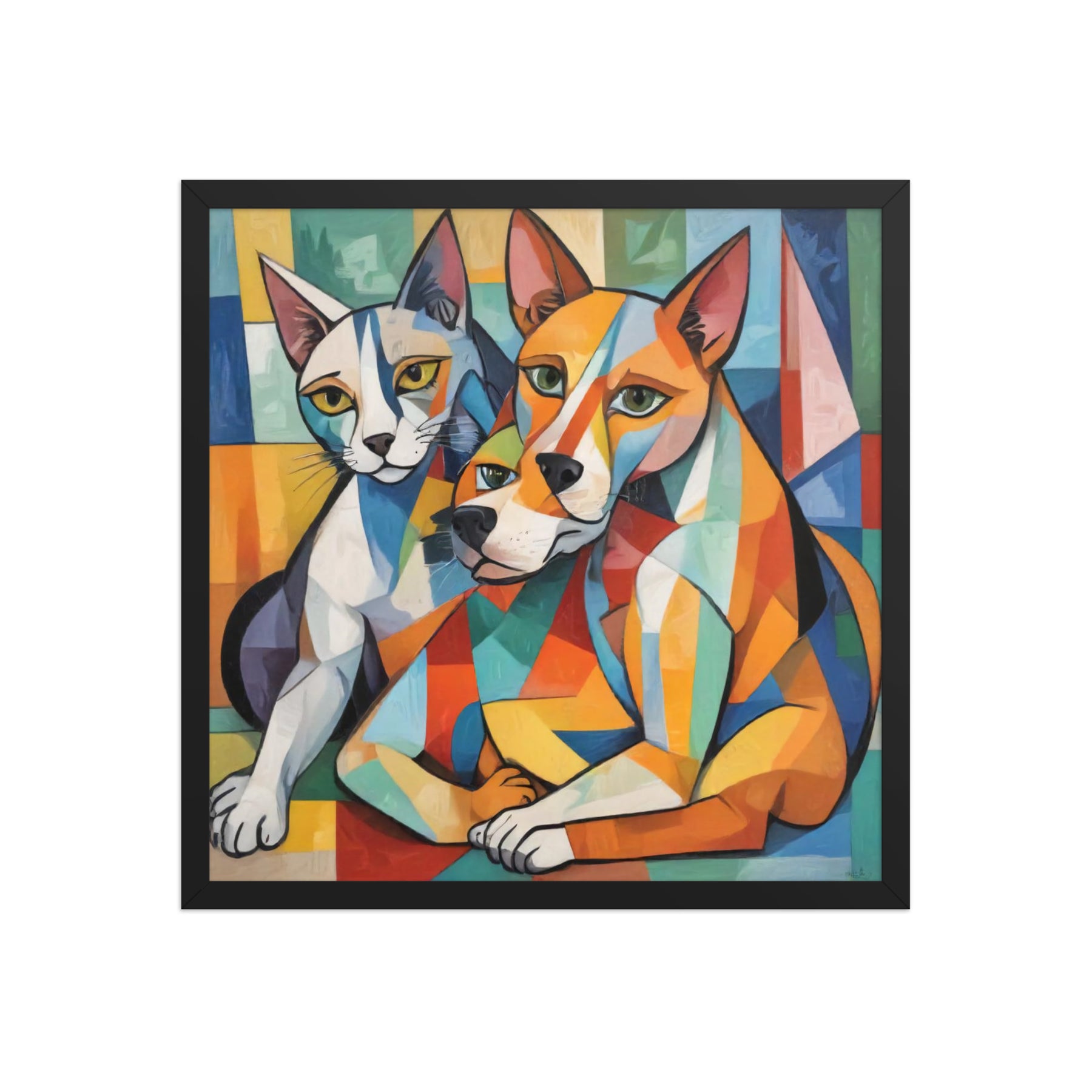 Bring vibrant whimsy to your space with "Two Dogs and a Cat," an abstract masterpiece by Darrell Griffin. Inspired by Picasso's bold palette, this framed poster bursts with electric blues, fiery reds, and sunny yellows, capturing two playful dogs and a sly cat in dynamic, cubist forms that dance across the canvas. Available in sizes from 8" x 10" to 24" x 36", it's printed on thick 10.3 mil (189 g/m²) matte paper for vivid, fade-resistant color.