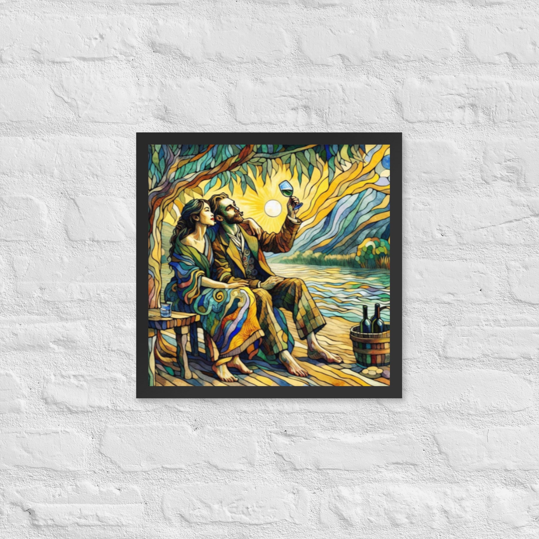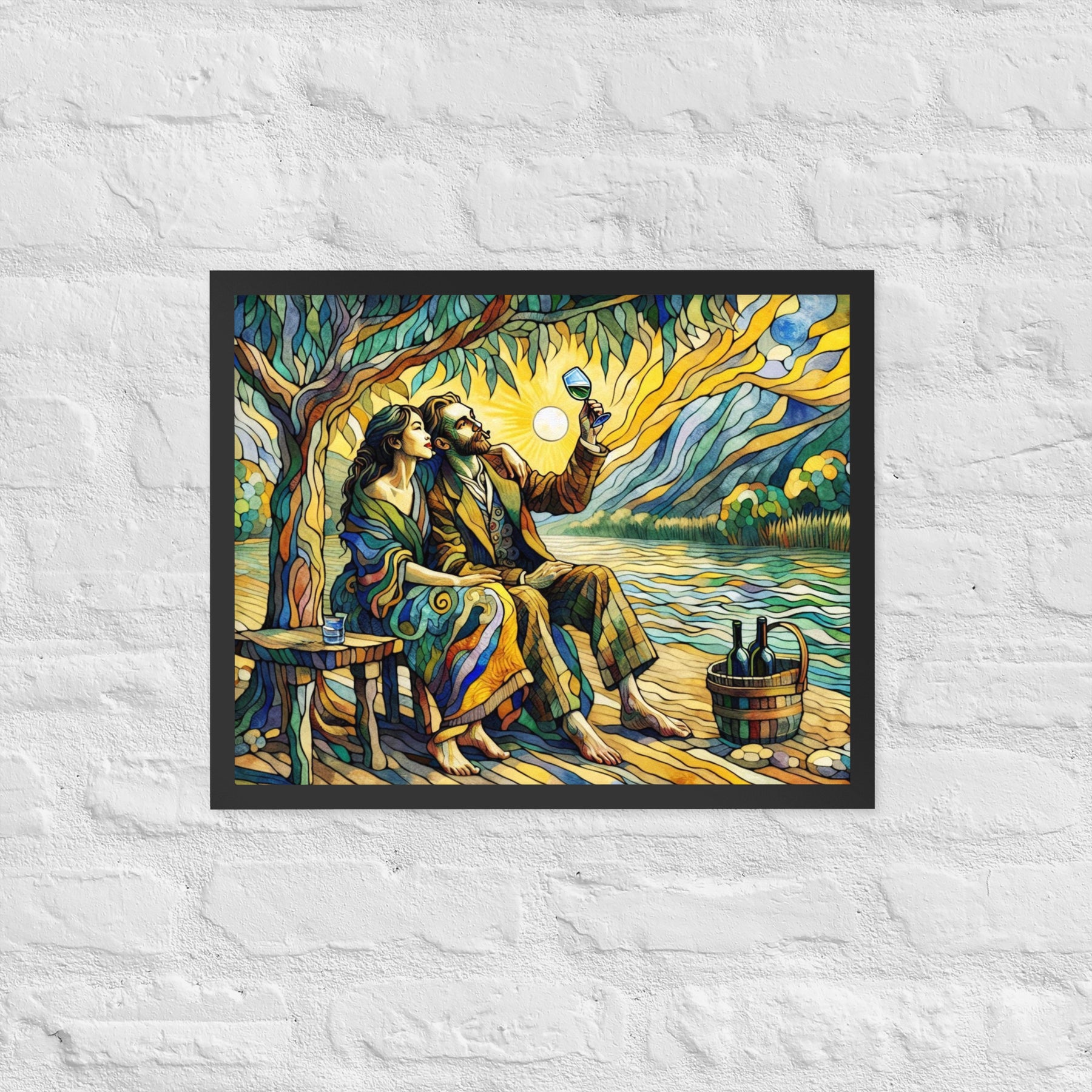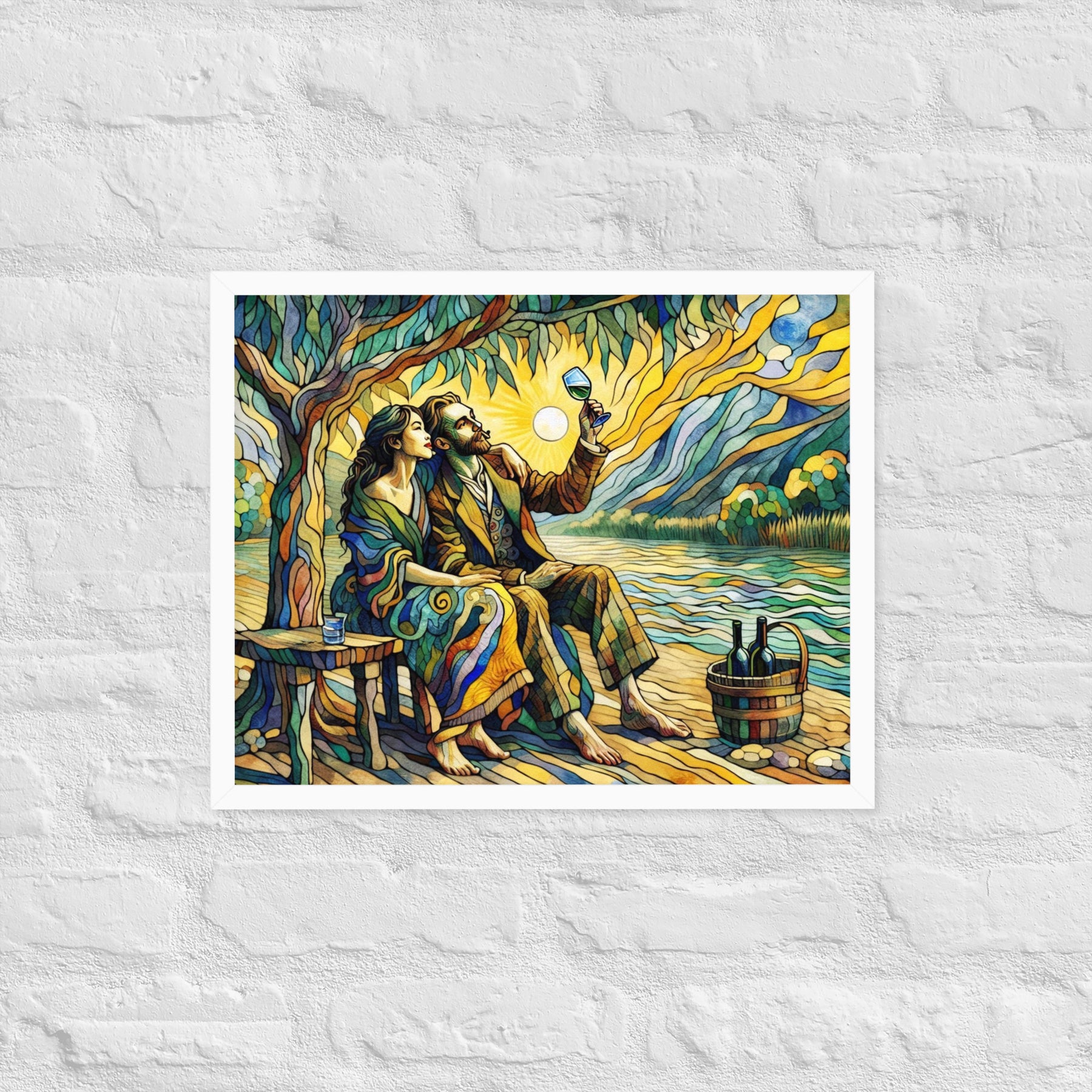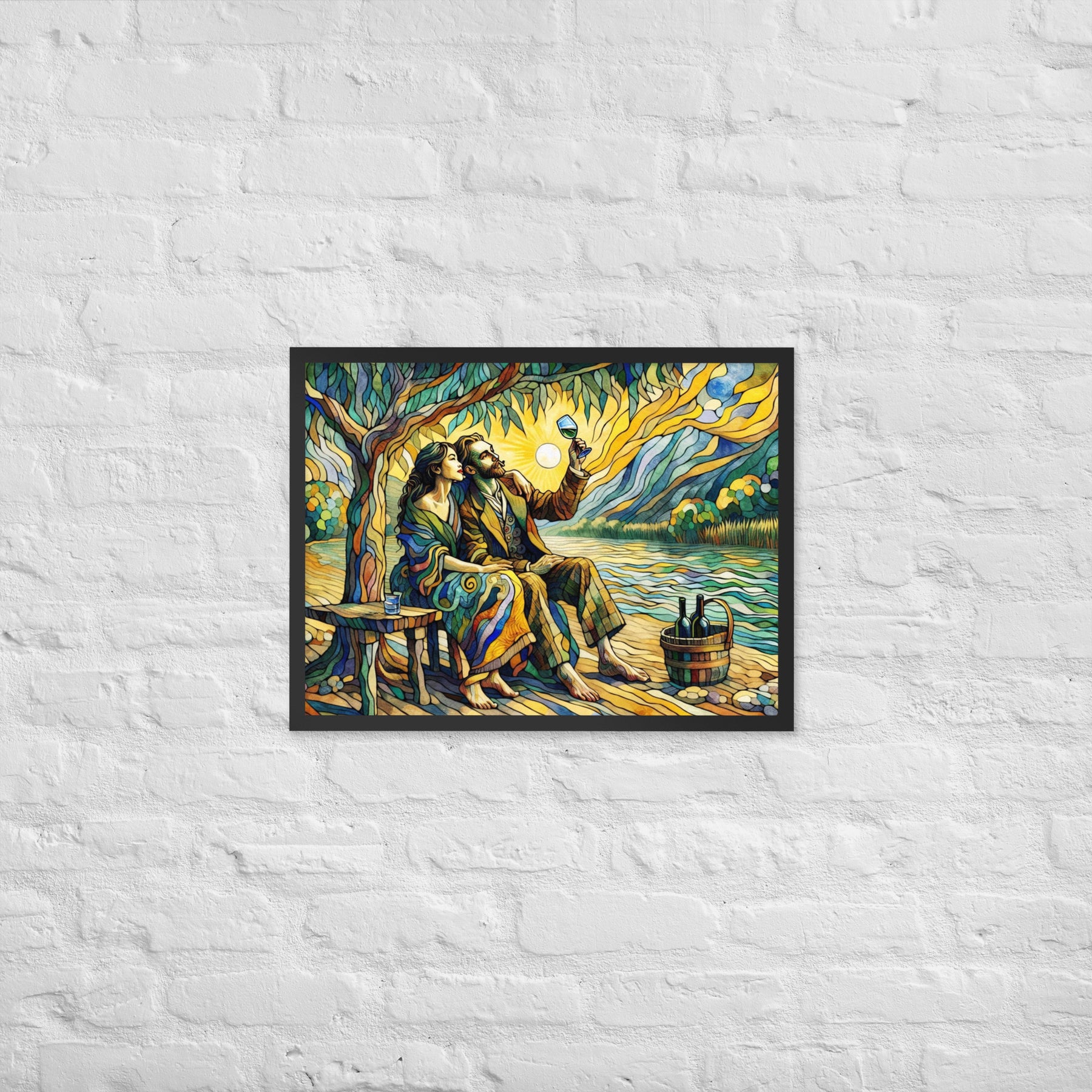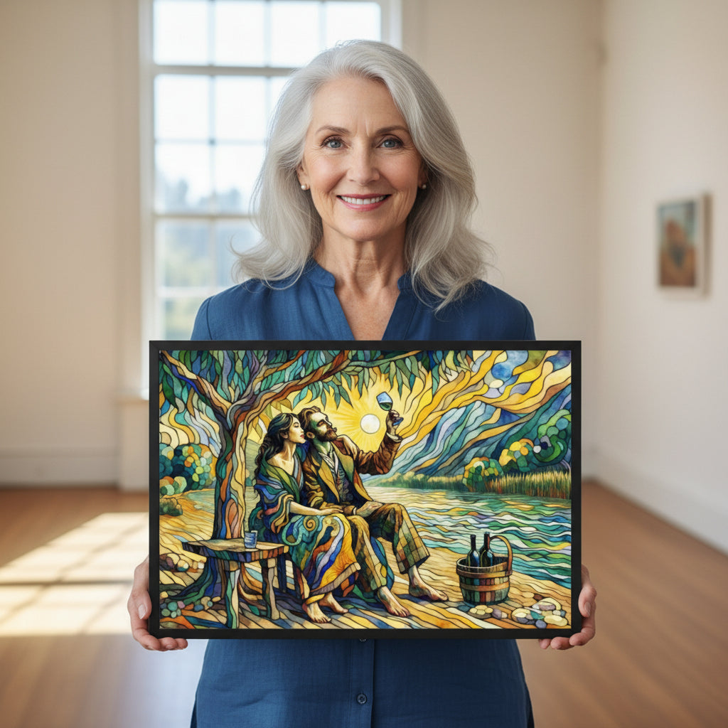 “Wine by the River” bursts with vibrant, Picasso‑kissed color as a man and woman share a bottle of wine beside a softly murmuring river. Their first date—born from a spark at work—glows with chemistry and possibility. Shaped through countless sketches and 30 Grok A.I. iterations by Darrell Griffin, this piece radiates bold, irresistible romantic energy.