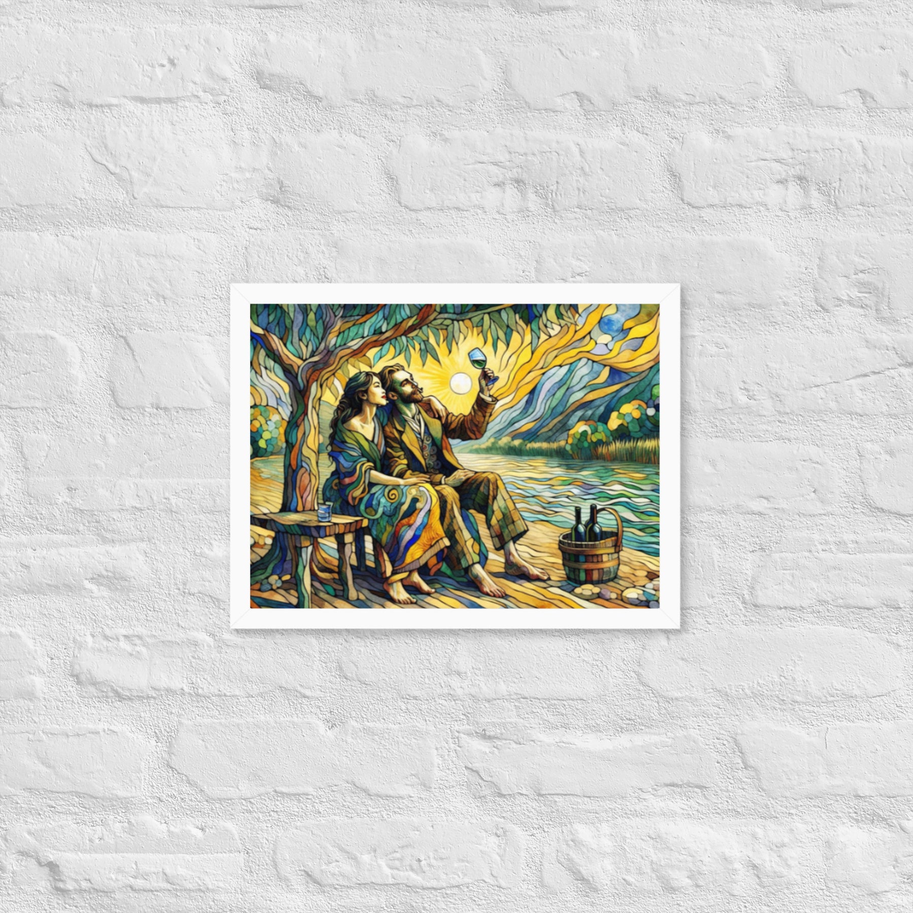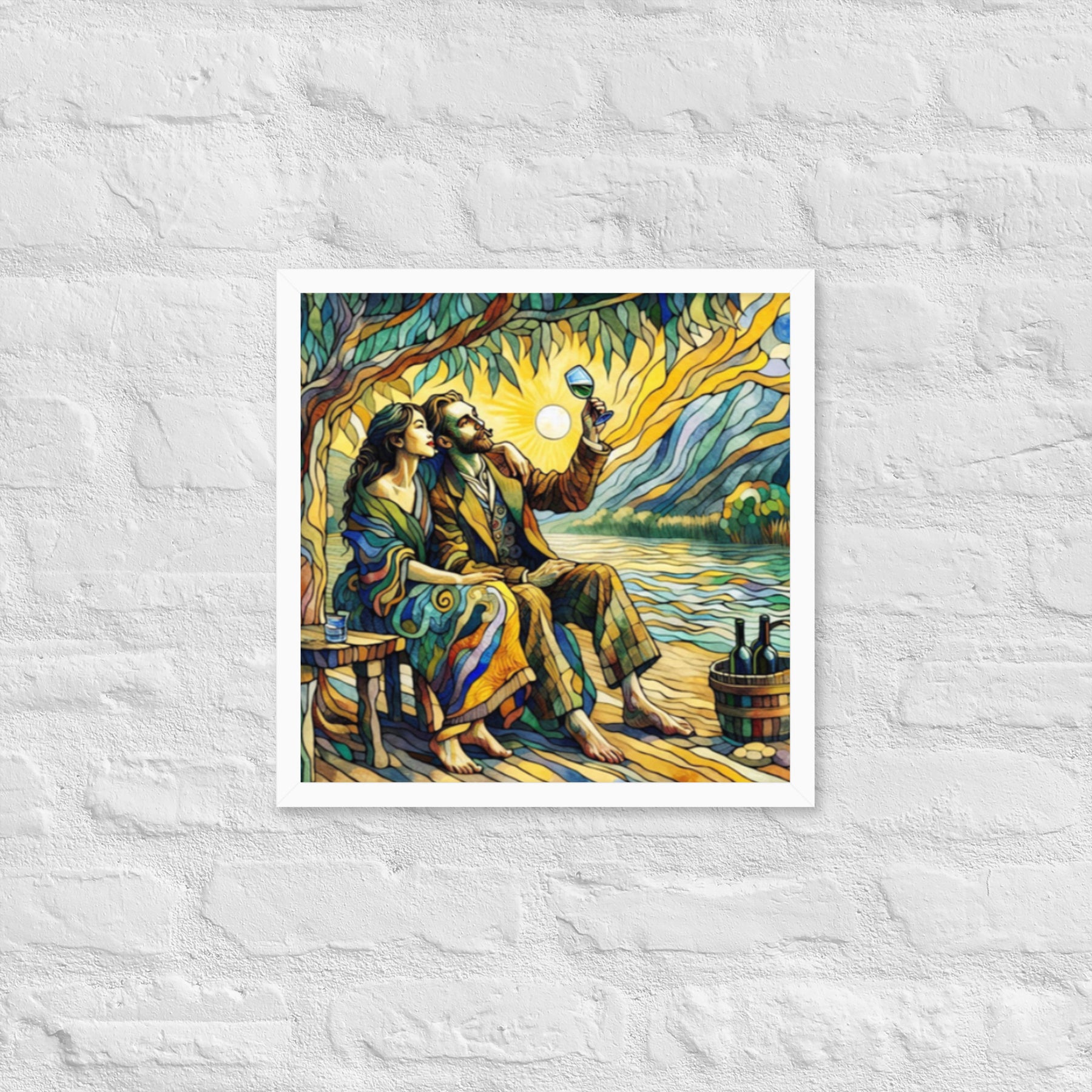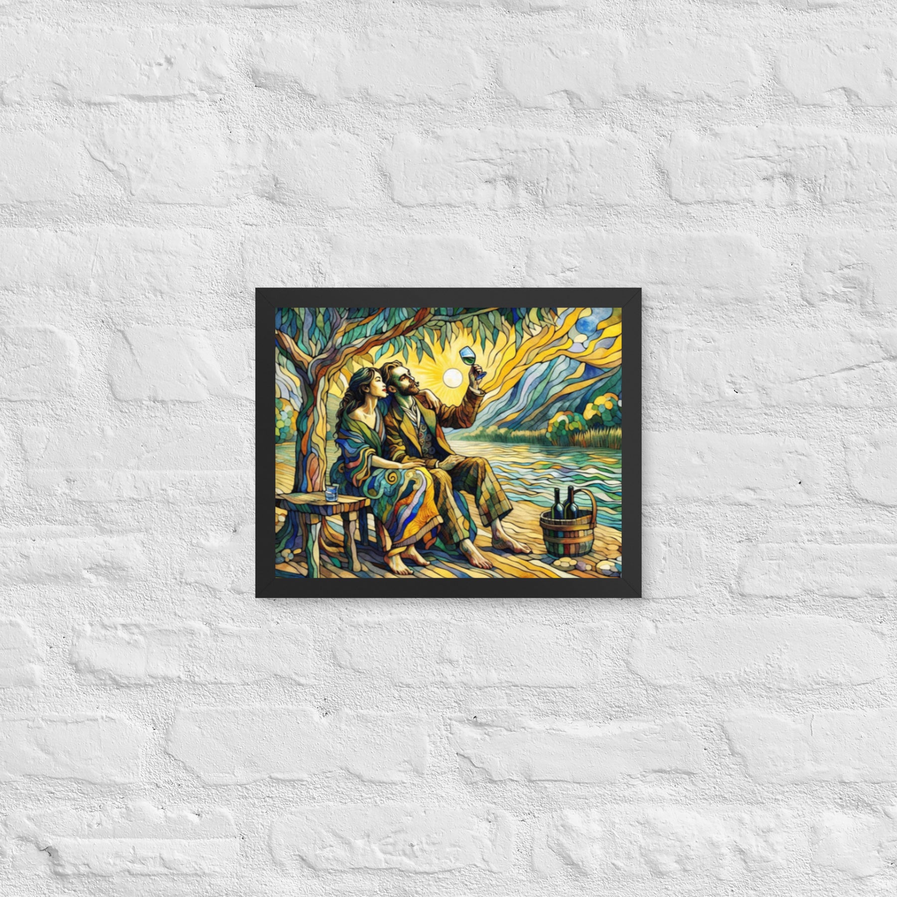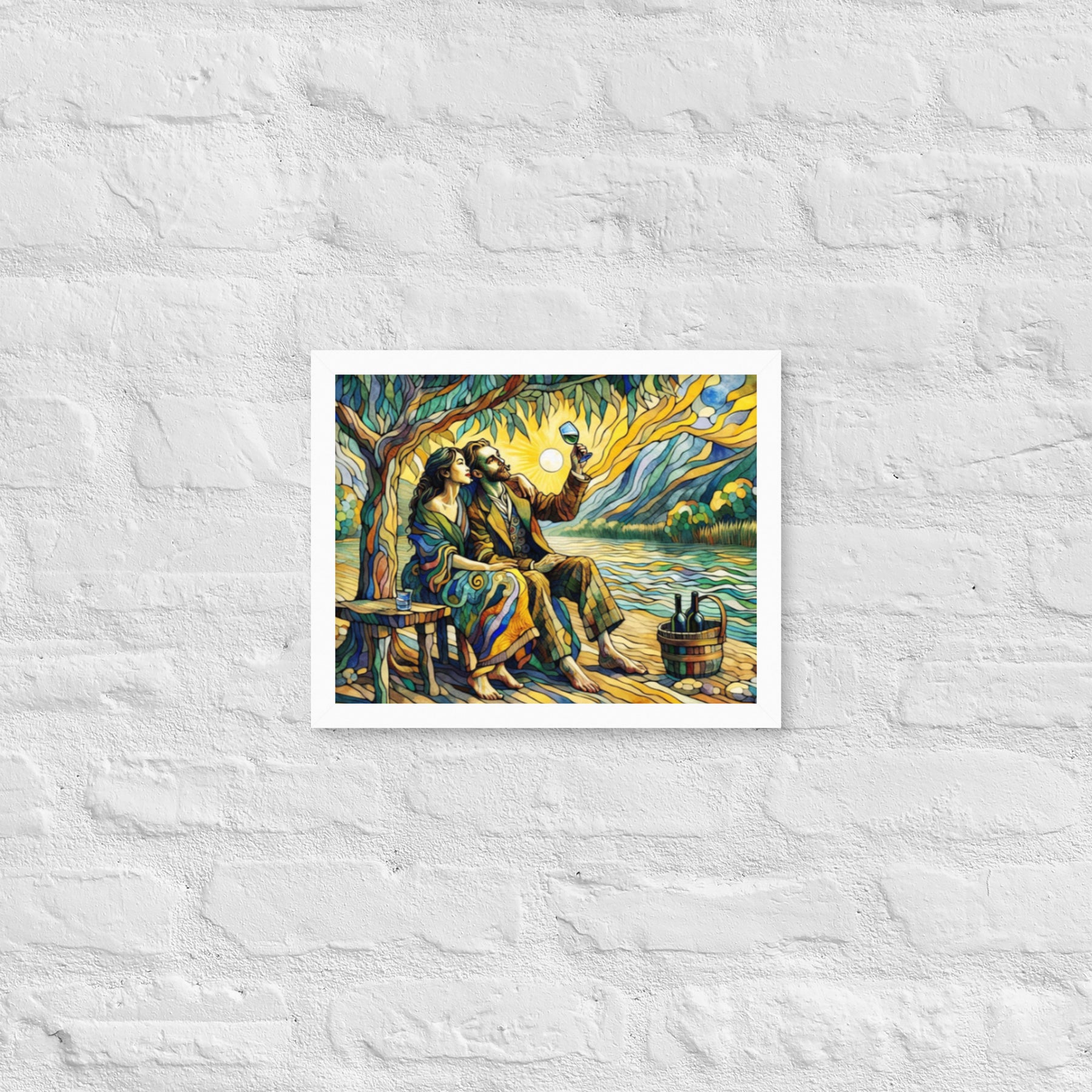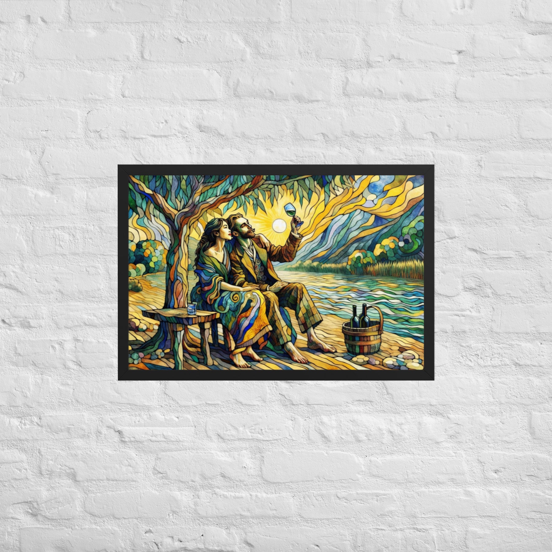 “Wine by the River” bursts with vibrant, Picasso‑kissed color as a man and woman share a bottle of wine beside a softly murmuring river. Their first date—born from a spark at work—glows with chemistry and possibility. Shaped through countless sketches and 30 Grok A.I. iterations by Darrell Griffin, this piece radiates bold, irresistible romantic energy.