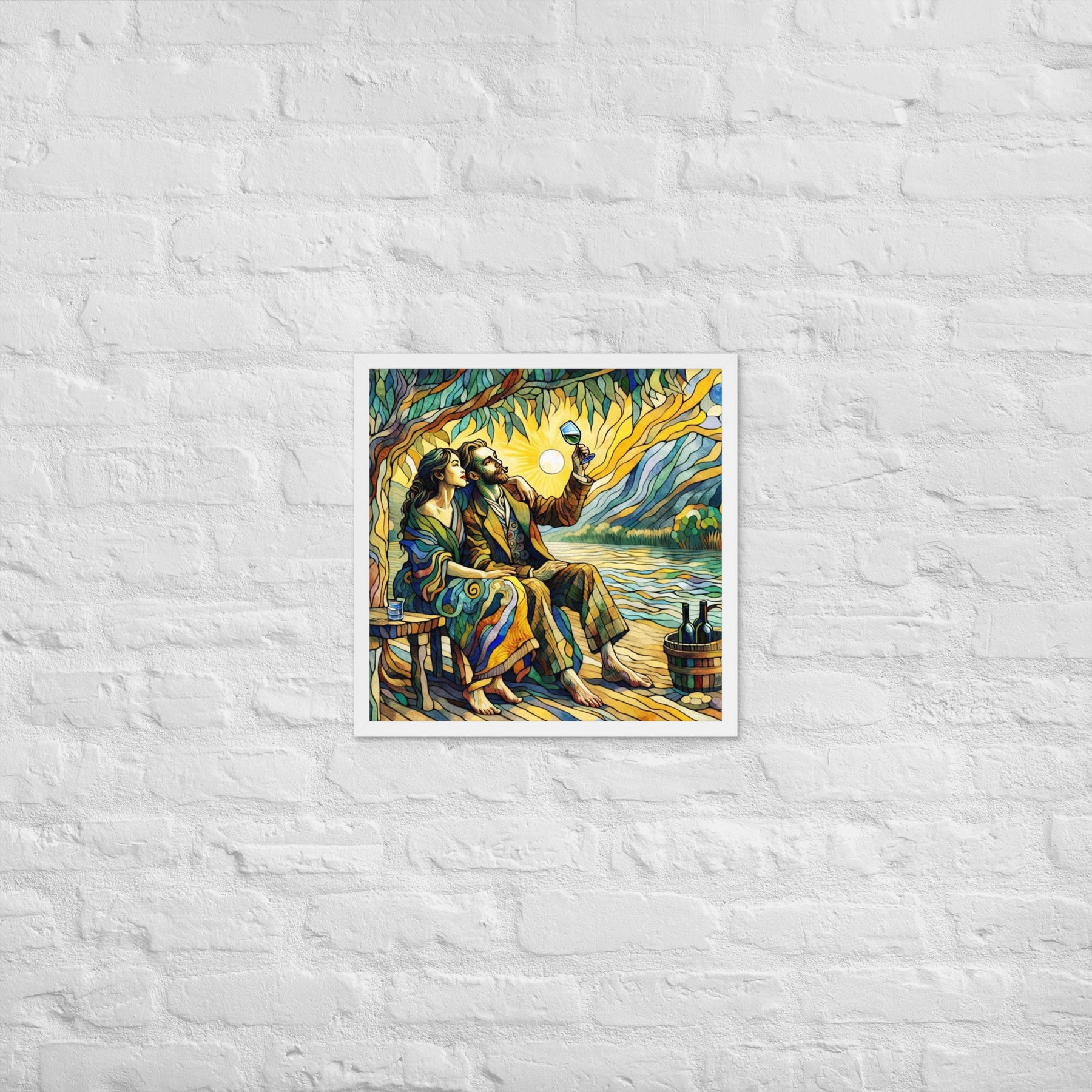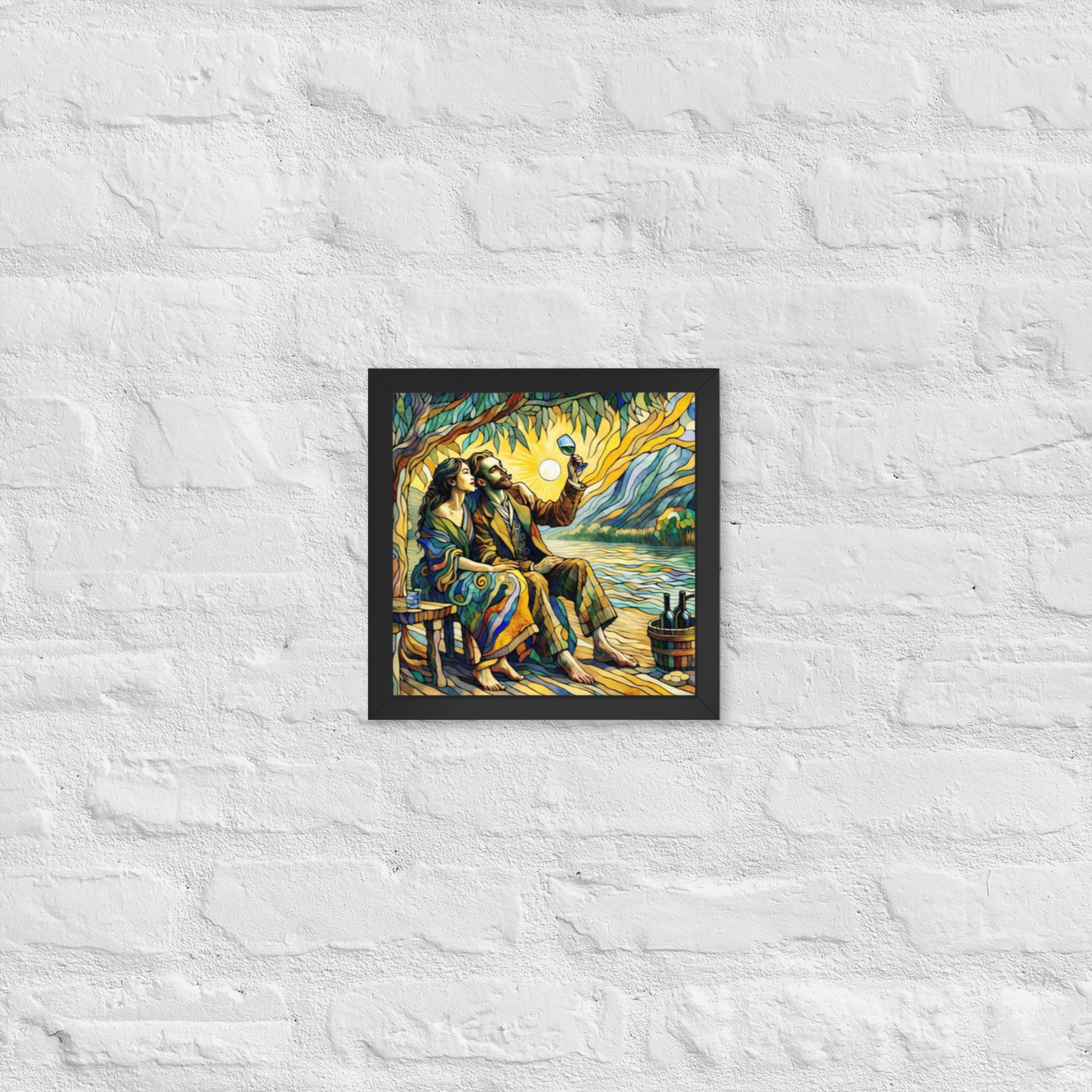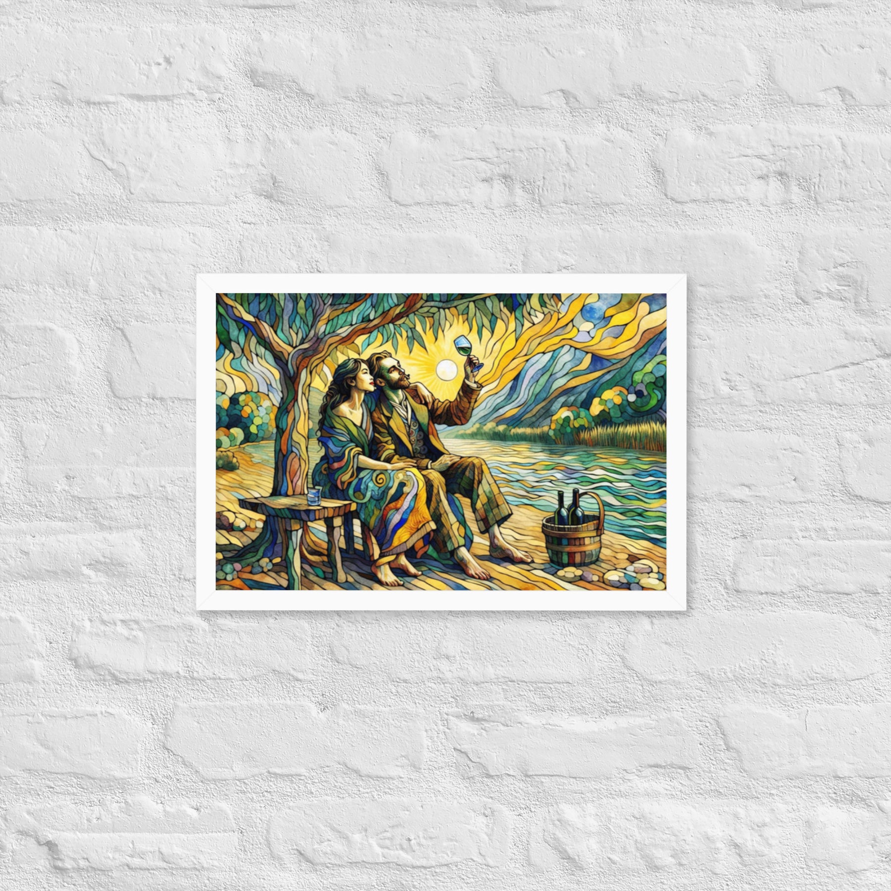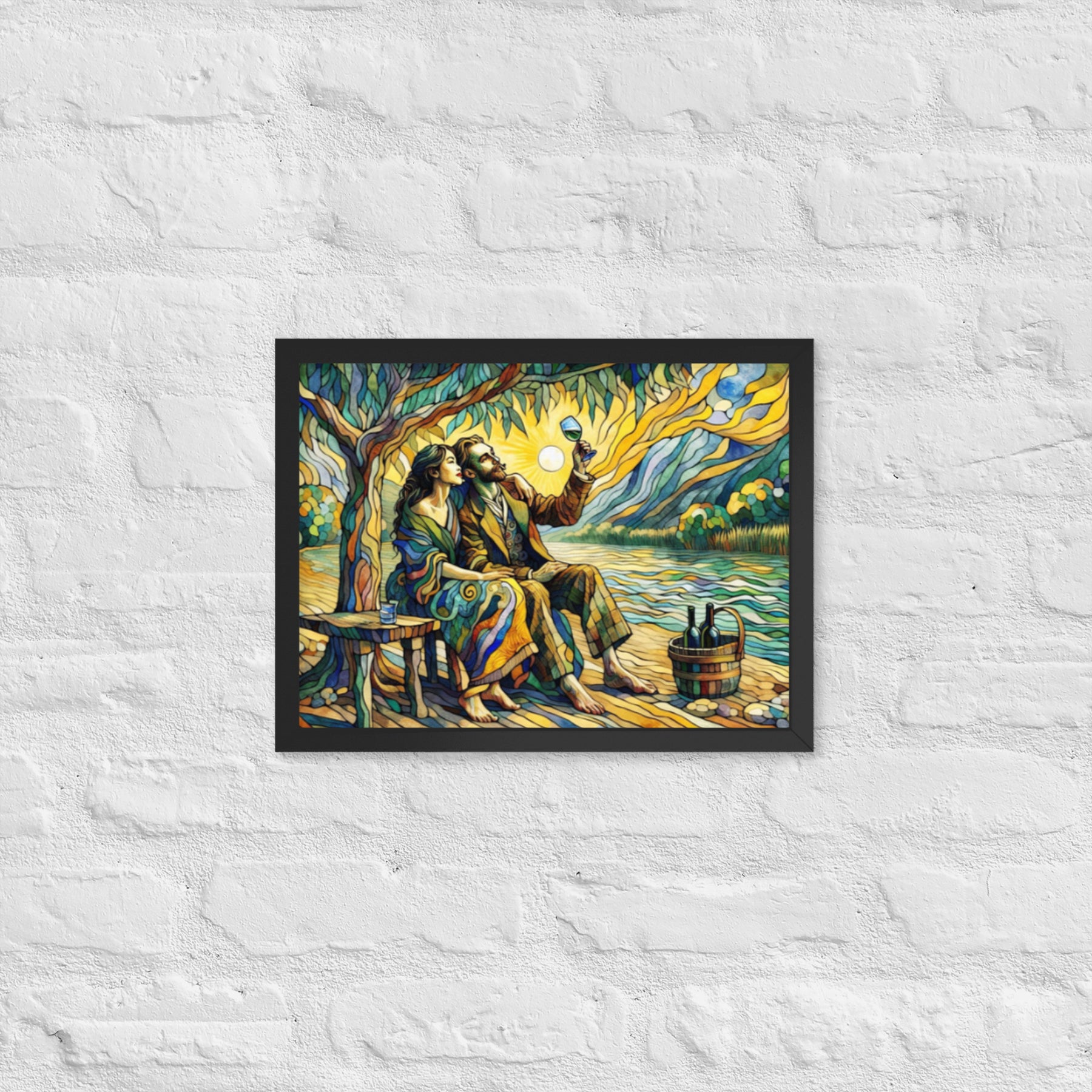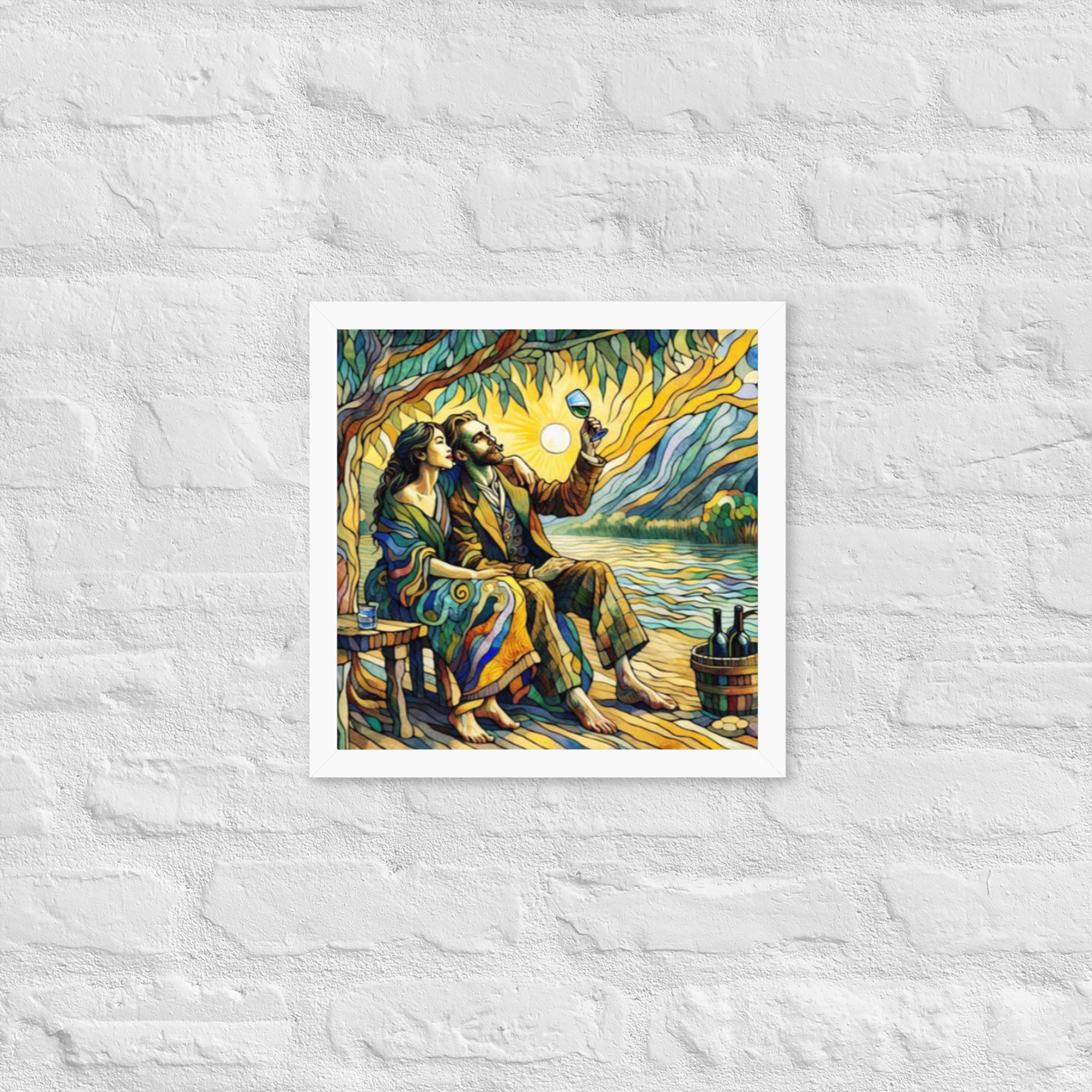 “Wine by the River” bursts with vibrant, Picasso‑kissed color as a man and woman share a bottle of wine beside a softly murmuring river. Their first date—born from a spark at work—glows with chemistry and possibility. Shaped through countless sketches and 30 Grok A.I. iterations by Darrell Griffin, this piece radiates bold, irresistible romantic energy.