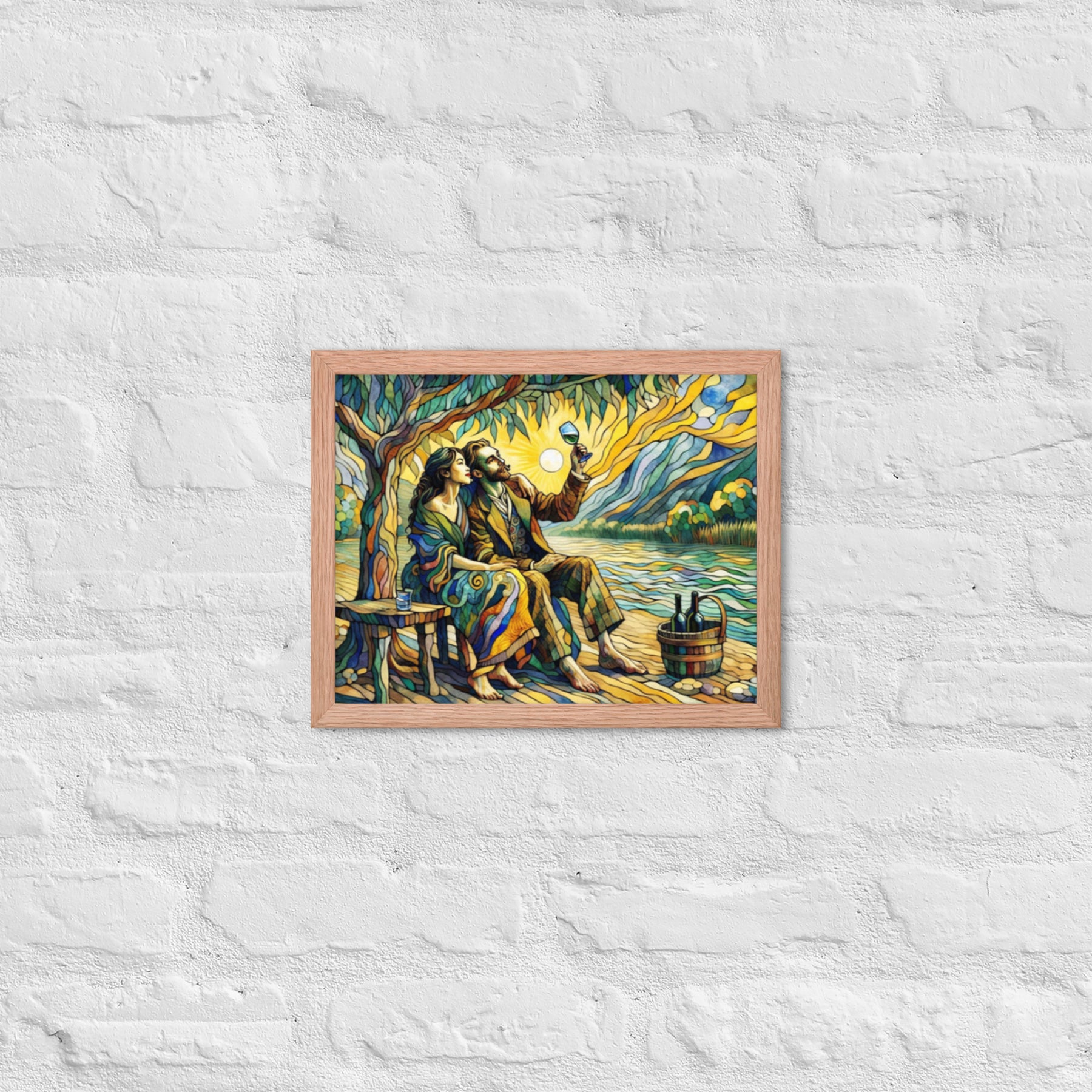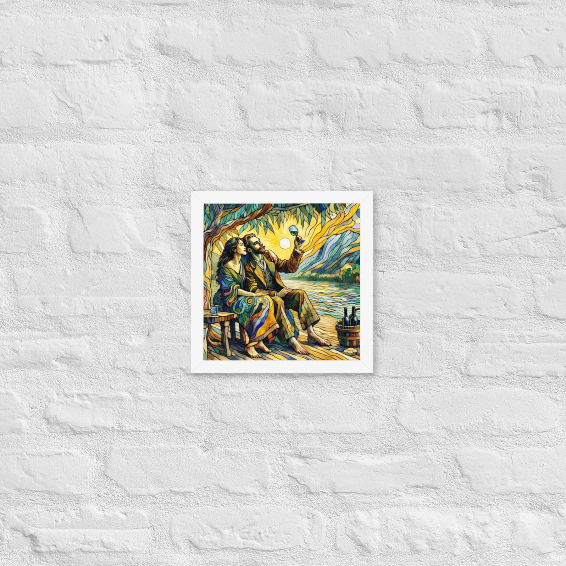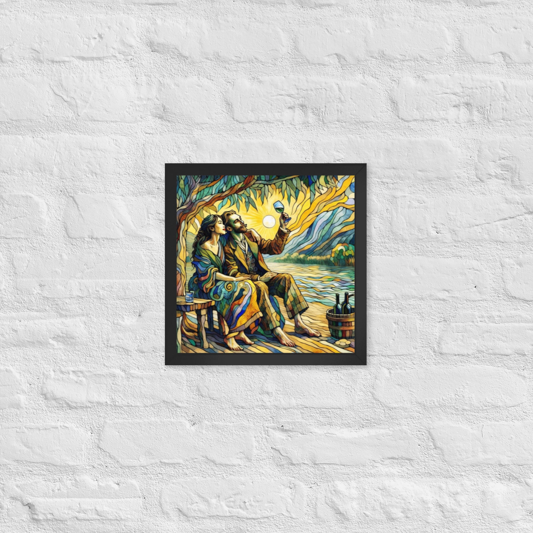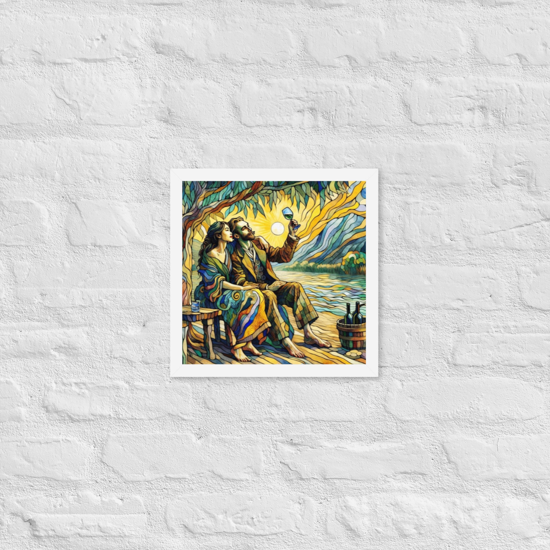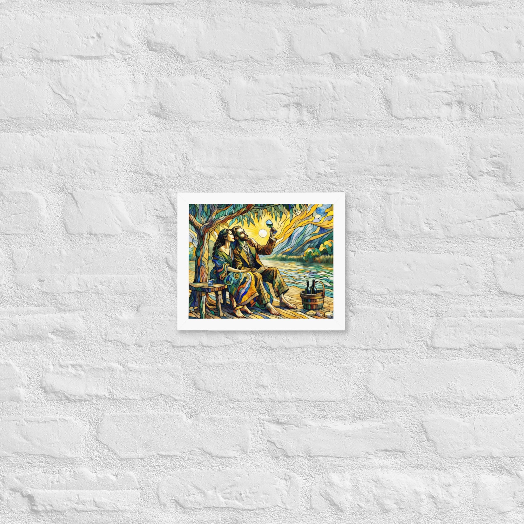 “Wine by the River” bursts with vibrant, Picasso‑kissed color as a man and woman share a bottle of wine beside a softly murmuring river. Their first date—born from a spark at work—glows with chemistry and possibility. Shaped through countless sketches and 30 Grok A.I. iterations by Darrell Griffin, this piece radiates bold, irresistible romantic energy.