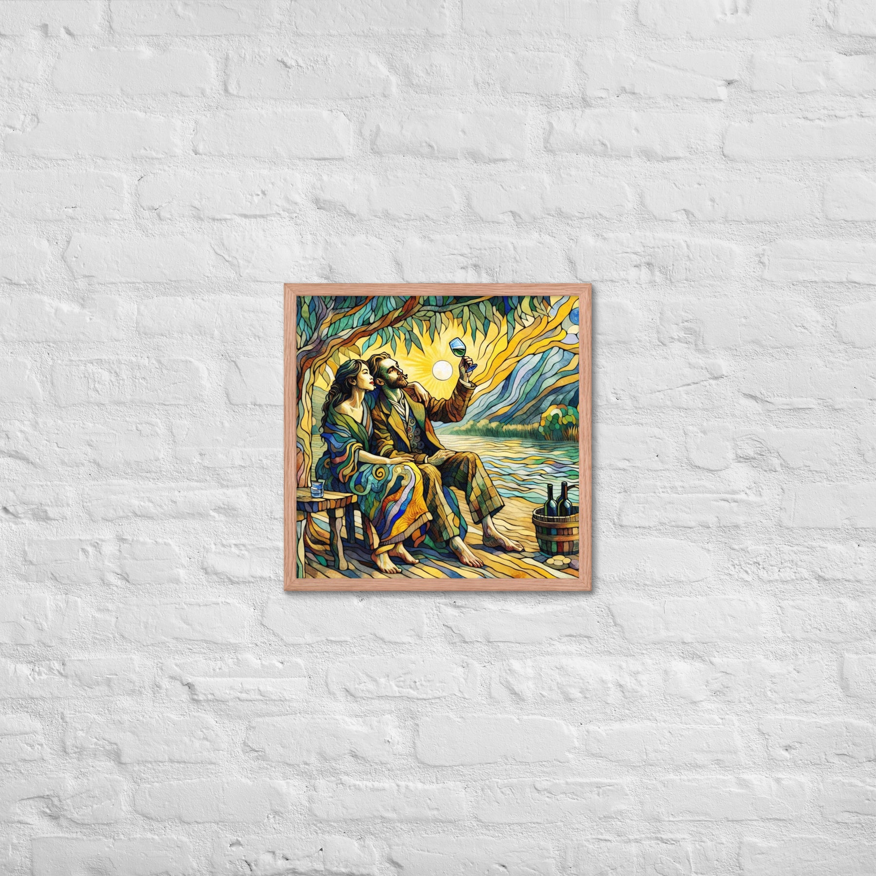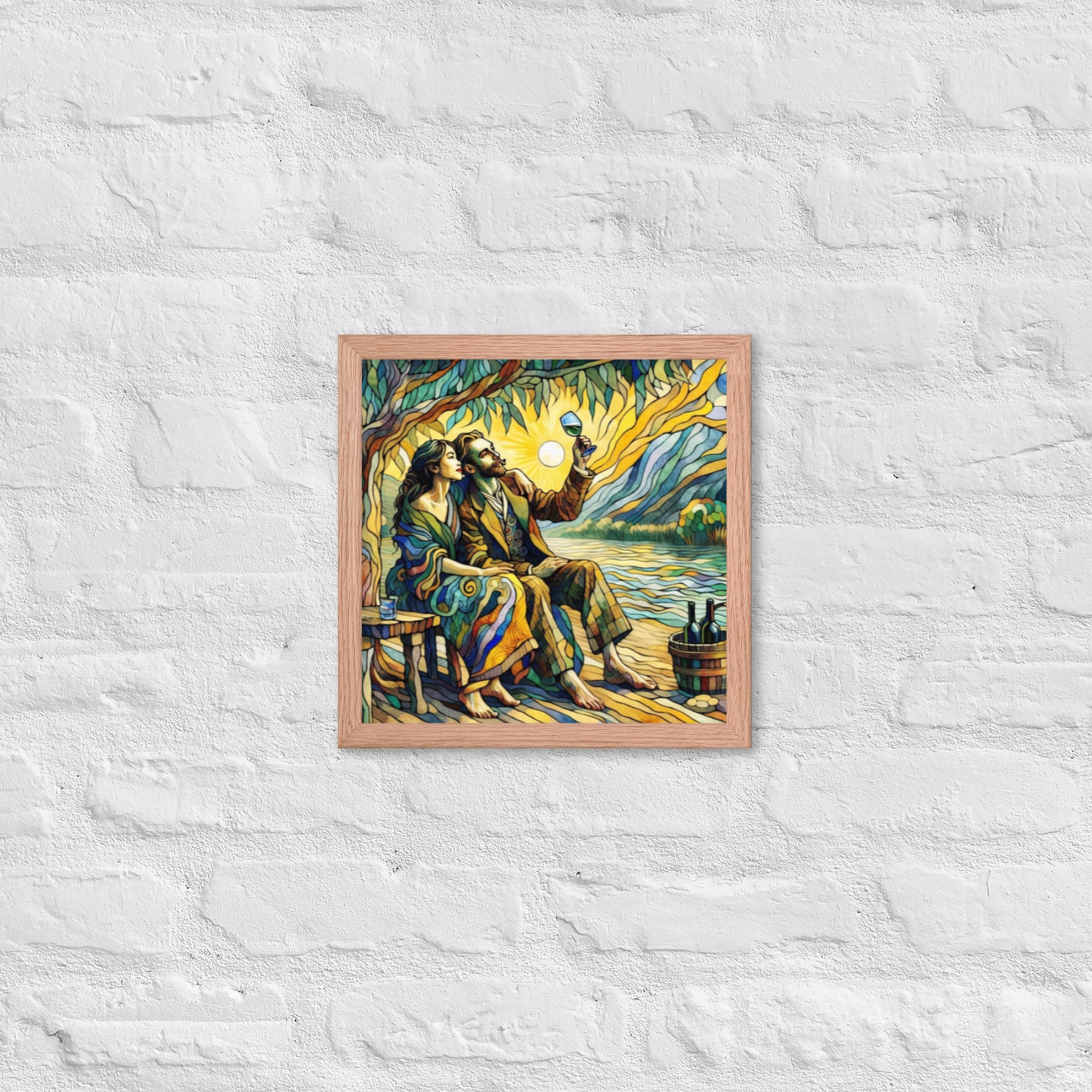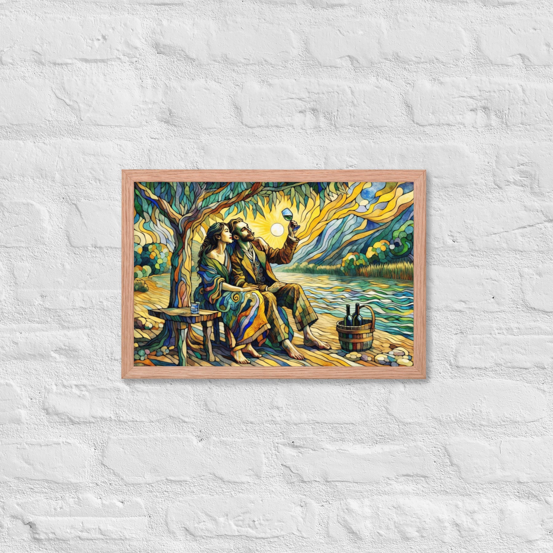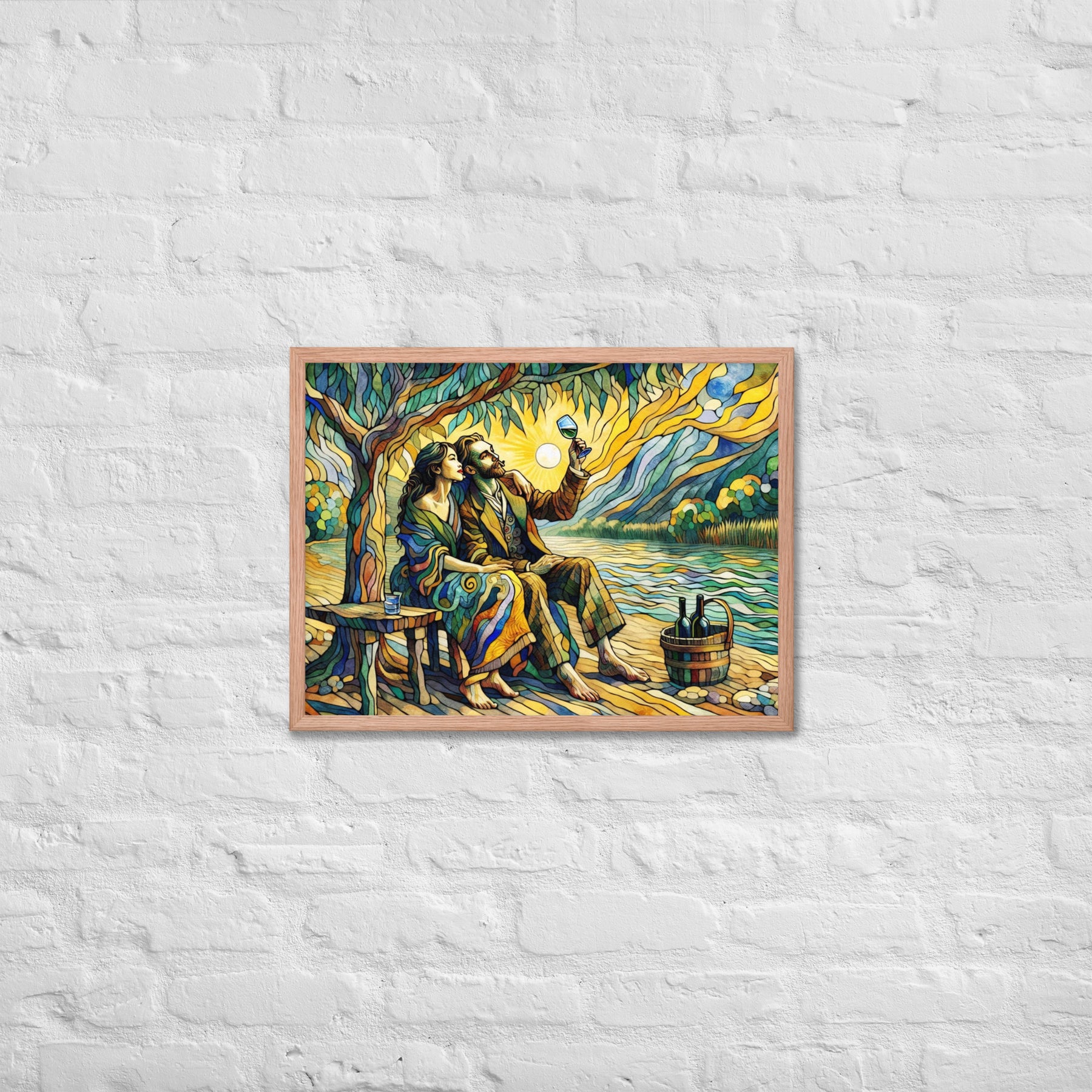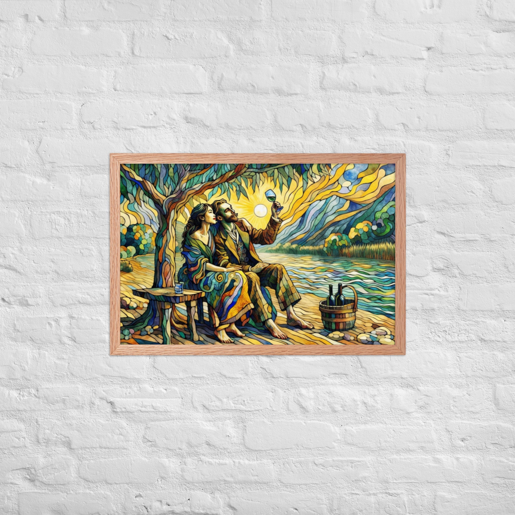 “Wine by the River” bursts with vibrant, Picasso‑kissed color as a man and woman share a bottle of wine beside a softly murmuring river. Their first date—born from a spark at work—glows with chemistry and possibility. Shaped through countless sketches and 30 Grok A.I. iterations by Darrell Griffin, this piece radiates bold, irresistible romantic energy.